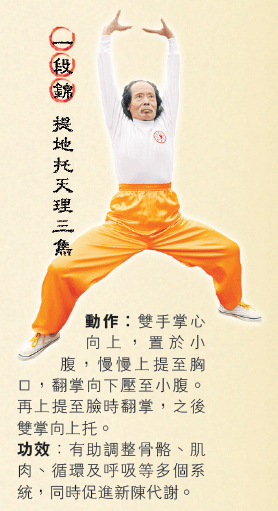 顧名思義,八段錦分為八段,每段均有不同歌訣,透過多種不同單式鍛煉,達到內臟器官的動態平衡,提高整體生理機能。「其實八段錦每一套動作各有功用,以第一段『提地托天理三焦』為例,這一段為全身伸展運動,有助強壯胸腔、腹腔、盆腔內的各內臟器官組織,同時亦伸展了全身肌肉、關節、筋骨、韌帶、肌腱。對於常見的都市病,如肩、頸、背痛,腰痠膝軟,四肢無力,手指關節不靈活,精神不振者,幫助會更加明顯。此外亦有助於改善彎腰駝背、歪脖斜肩、高低肩等不良姿勢。」