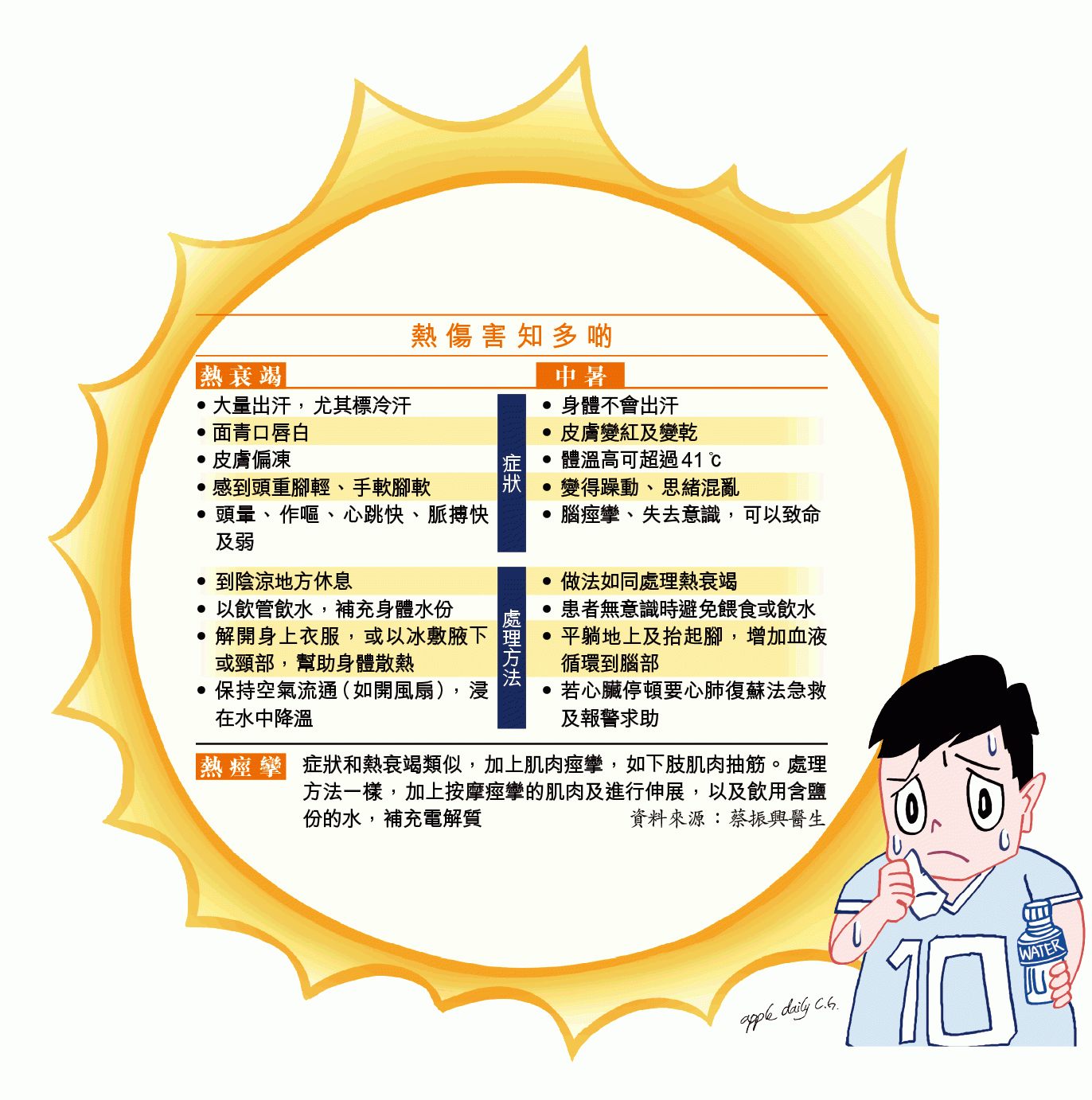 香港急症醫學會會長蔡振興稱,一般人常說的中暑,醫學上統稱為「熱傷害」(Heat Illness),分為三類,包括熱衰竭(Heat Exhaustion)、熱痙攣(Heat Cramps)及中暑(Heat Stroke),其中熱衰竭最常見,病情比中暑輕微,患者多為行山人士或在通風較差地方工作的工人。他說,今年4、5月高溫的日子,醫院急症室每周接獲約10宗行山熱衰竭個案,包括一些缺乏遠足經驗的行山新手,多是朋友臨急號召下出發,沒做好防暑準備或行山計劃,如着錯厚身衣服礙散熱,或無戴透氣帽,長時間在陽光下暴曬而出事。