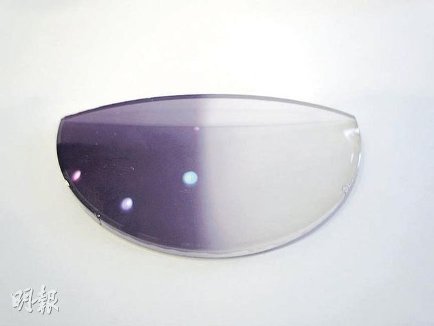 圖1:變色鏡片表面的塗層接觸紫外線後,色調會自動變深,透光率隨即下降(見鏡片的左半),減少刺眼。(何慧凝攝)