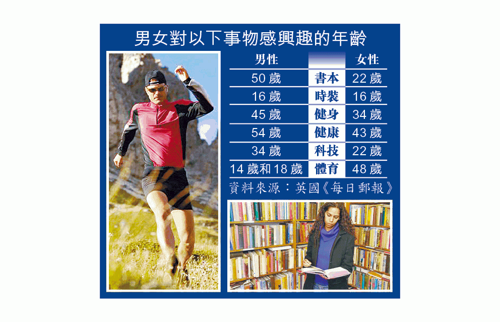 例如女性平均34歲開始認真做運動,男性就要45歲才會注重體形;女性22歲最愛看書,男性要到50多歲才有心情閱讀文學。44歲女性最愛講電視經,男性31歲後就興趣大減。