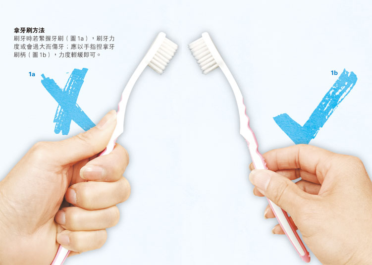 正確做法﹕選用軟毛牙刷,以手指拿牙刷柄輕刷;先用牙刷蘸些許水,擠上牙膏,再刷牙;刷牙時以2至3隻牙為一組,每組的外側面、內側面和咀嚼面均以打圈方式刷六七次,刷完後以輕掃牙齒,感覺表面光滑即可,若仍有粗糙感,可再刷兩三次