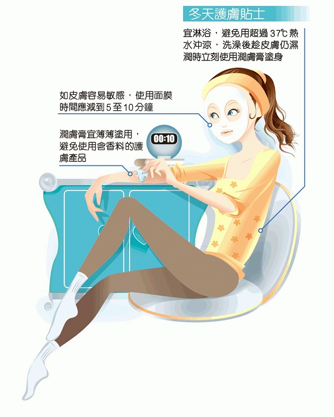 皮膚是身體最大器官,可防止感染、具保溫及鎖水功效,故護膚程序其實不分男女,男士也要勤護膚。他說,一般人最常忽略腳部,致腳部易有濕疹,出現龜裂、脫皮及出紅疹症狀。女士愛用含香料的潤膚產品,惟冬天皮膚乾燥,容易過敏,故應避免採用。