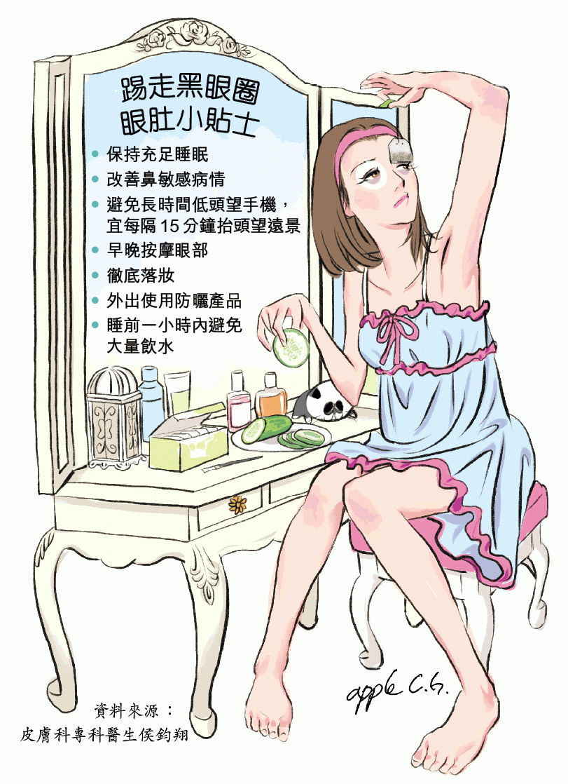 睡眠不足,早上起床時「熊貓眼」現形是女士大忌,但原來除了「唔夠瞓」外,長期做低頭族,向下望睇手機或板腦,甚至鼻敏感發作頻密,均會引致眼部的淋巴腫脹及靜脈血液循環變差,造成黑眼圈或大眼肚。皮膚科醫生指出,敷茶包、熟蛋或青瓜等偏方成效無根據,隨時弄巧反拙,建議可打圈按摩眼部作改善。