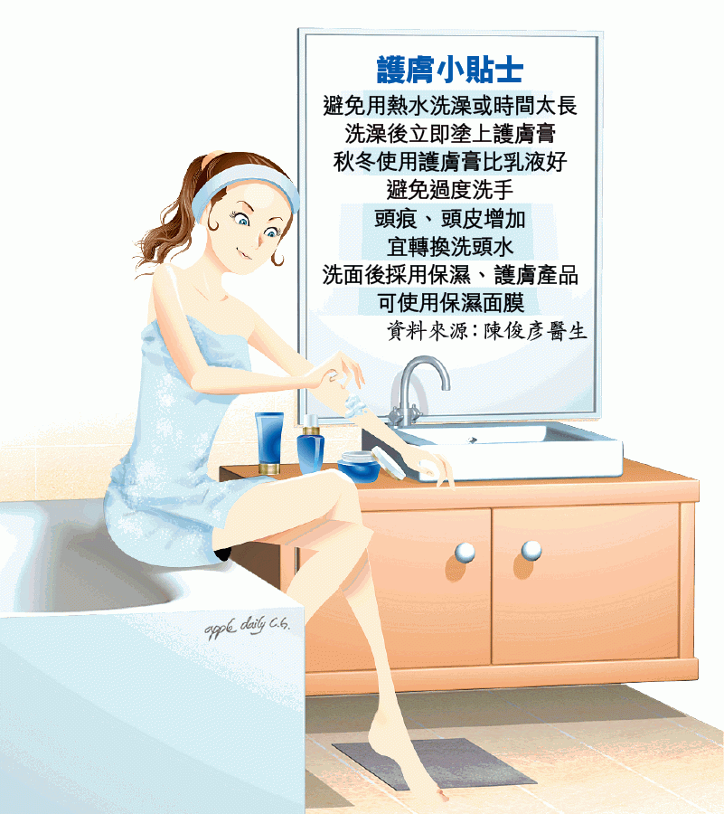 乾燥天氣漸近,令皮膚繃緊及痕癢不時出現,都是常見的秋冬皮膚症狀,尤其愛靚一族需加強護膚保濕。皮膚科醫生教路,應避免用熱水洗澡或過度洗手,以免洗走具保護作用的油脂層。溫水洗澡後,要立即塗上含油性的護膚膏,如帶有凡士林成份,可為皮膚鎖水,預防皮膚轉差。