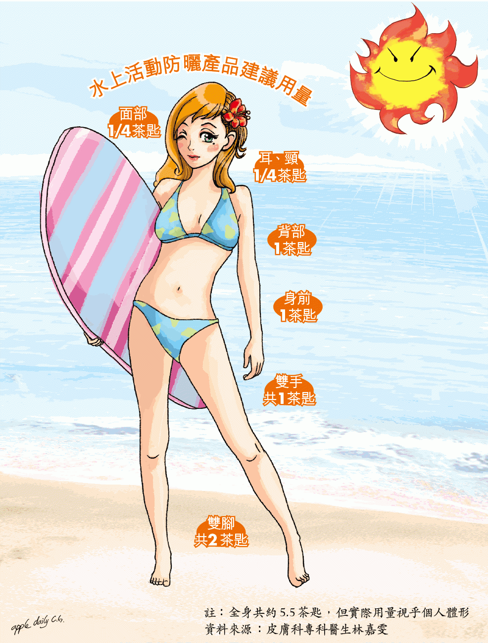 炎夏進行戶外活動,要對抗猛烈陽光對皮膚的傷害,需小心選擇及使用防曬產品,提防曬傷,甚至引致皮膚癌的風險。皮膚科專科醫生林嘉雯表示,揀啱防曬產品度 數、因應皮膚情況選擇合適產品、進行皮膚測試、塗用全身需約5至6茶匙防曬產品,女士們並要於化妝前塗獨立的防曬用品,是預防曬傷的五大關鍵。