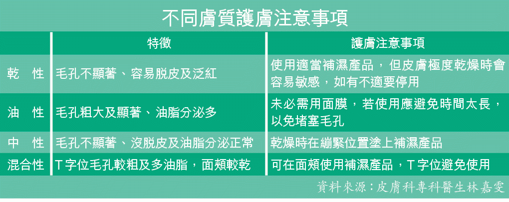 其他膚質人士,如油性皮膚即毛孔粗大及油脂分泌多,若要使用面膜需小心,避免長時間敷上,預防毛孔被堵塞,引致生暗瘡或粉刺,結果得不償失。