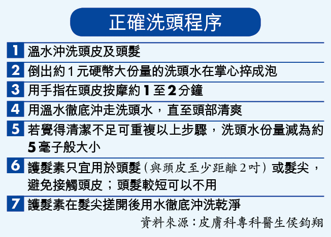 正確的洗頭方法很重要,侯稱,過程是洗頭皮不是頭髮,應將洗頭水捽至起泡後,放在頭皮上按摩1至2分鐘,徹底清潔頭皮的分泌物,切忌用指甲抓頭皮,以免損害皮膚的屏障。