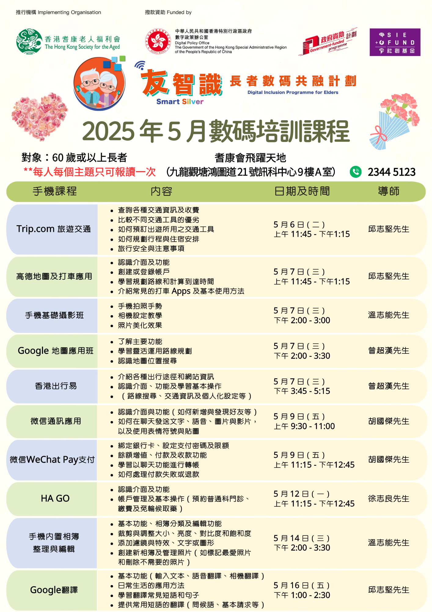 「友智識 - 長者數碼共融計劃」5月免費手機課程 現已招生