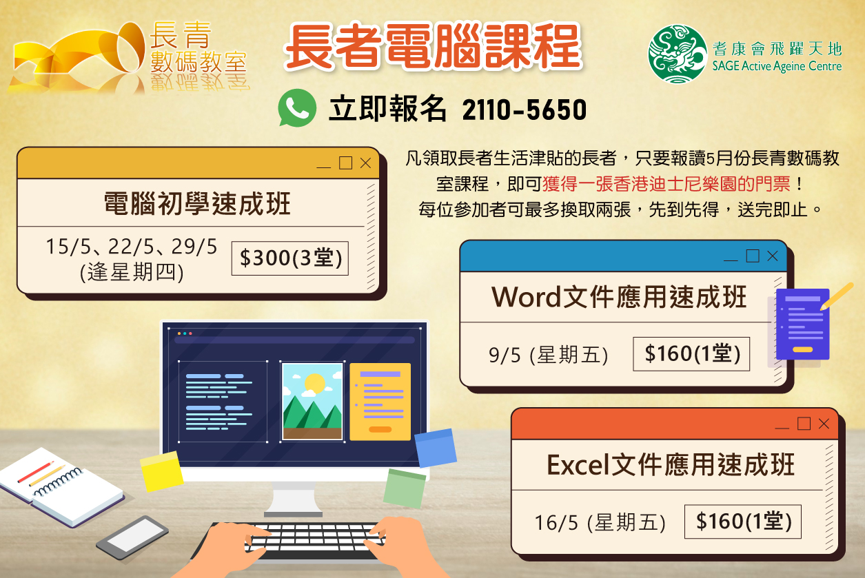 凡領取長者生活津貼的長者,只要報讀5月份長青數碼教室課程,