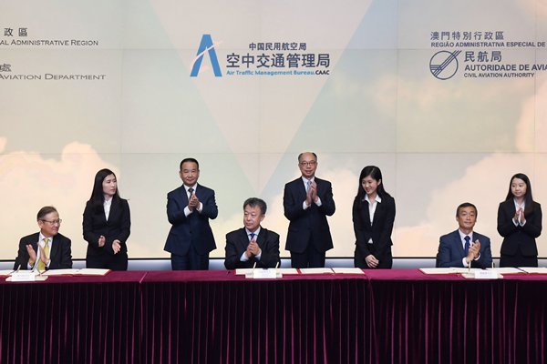 在陳帆和呂爾學見證下,中國民航局空管局局長車進軍、香港民航處處長李天柱、澳門民航局局長陳穎雄簽署《粵港澳大灣區空域協同發展三方協定書》。