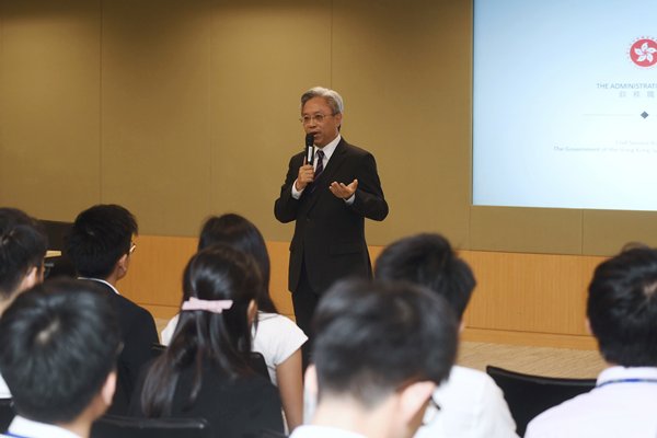 公務員事務局局長羅智光昨日與參加政務職系暑期實習計劃的大學生見面,了解他們的實習體驗和得着。