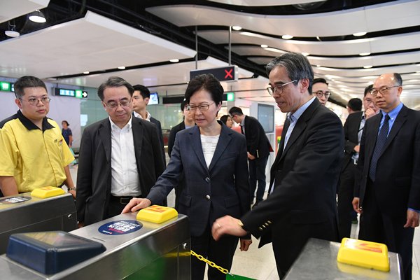 林鄭月娥早上在運輸及房屋局局長陳帆陪同下,到港鐵中環站視察損毀設施和維修情況。中環站是9月8日被激進示威者大肆破壞的港鐵車站之一,暴徒更在站外縱火,嚴重威脅市民安全。