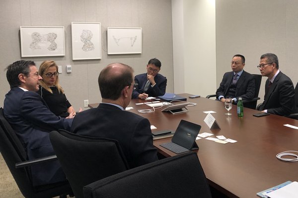 陳茂波會晤國際資本市場協會總裁馬丁‧謝克,提到本港綠色金融市場增長迅速,去年在港發行的綠色債券總額達110億美元。他又闡述本港推動金融發展的措施,期望港美繼續加強合作。