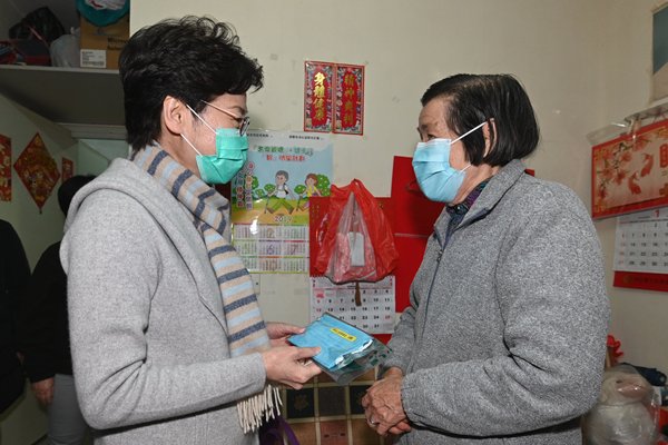 林鄭月娥先到藍田德田邨,向獨居長者派發口罩、食物、健康資訊單張及其他物資,並送上問候。她又到訪樂善堂位於九龍城的社會房屋和鄰近的劏房單位,向基層住戶派發口罩等物品,了解他們的生活情況。