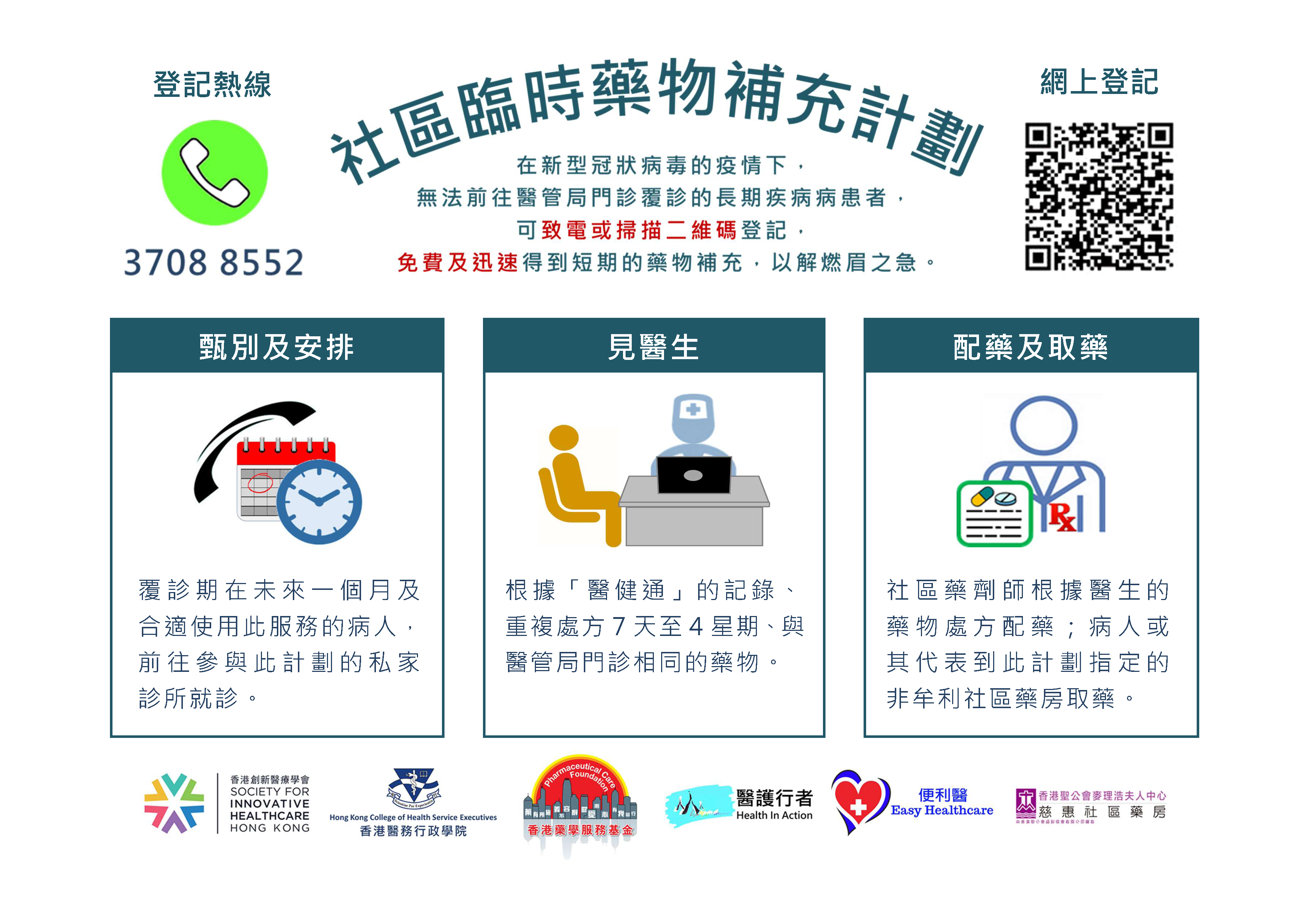 「社區臨時藥物補充計劃」是為在新型冠狀病毒的疫情下,無法前往醫管局門診覆診的長期病病患者而設,讓病人可以得到短期的藥物補充,以解燃眉之急。