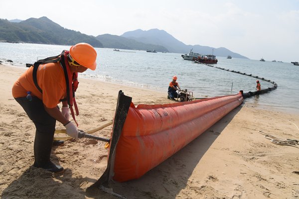 模擬油污事故發生後,運油船在南丫島下尾灣海面拋錨,救險隊伍轉卸損毀船艙的燃油和堵塞漏油裂縫,從源頭堵截燃油溢漏。油污清理隊伍架設圍油欄把運油船包圍,並用圍油欄在運油船附近架設海上屏障,防止油污擴散。