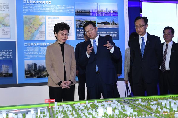 林鄭月娥早上在政制及內地事務局局長聶德權陪同下,參觀江北新區規劃展示館,了解該區的發展規劃。江北新區是江蘇省唯一國家級新區,銳意發展創新和現代產業,並作為長江經濟帶對外的開放平台。