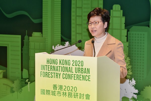 香港2020國際城市林務研討會今日在中環大館賽馬會立方揭幕,逾20位來自中國內地、海外和本地的主講嘉賓,就綠色城市、韌性景觀和樹木護理等主題分享見解,行政長官林鄭月娥、發展局局長黃偉綸出席典禮。