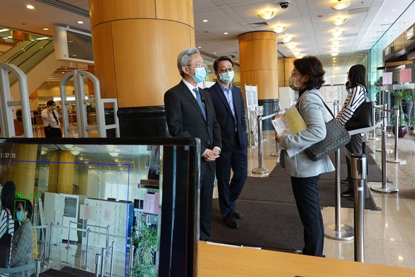 檢測措施: 羅智光(左一)在中央圖書館聽取康文署助理署長(圖書館及發展)鄭劉美莉(左三)介紹圖書館實施的體溫檢測措施。旁為康文署署長劉明光(左二)。
