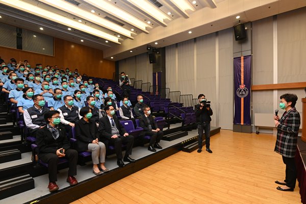 林鄭月娥11日到訪民安隊總部時說,2019冠狀病毒病已困擾香港一段日子,抗疫工作仍需持續,她期望參與檢疫中心工作的人員齊心打贏防疫戰,並希望進入檢疫中心接受檢疫的香港居民更多認識民安隊。