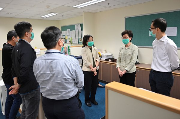 行政長官林鄭月娥4月17日到訪社會福利署位於將軍澳的社會保障辦事處,為近月在疫情下處理大量社會保障計劃申請和查詢的社署人員打氣。