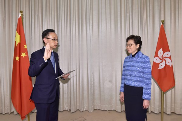 換新崗位: 新任公務員事務局局長聶德權(左)在行政長官林鄭月娥監誓下宣誓就職。