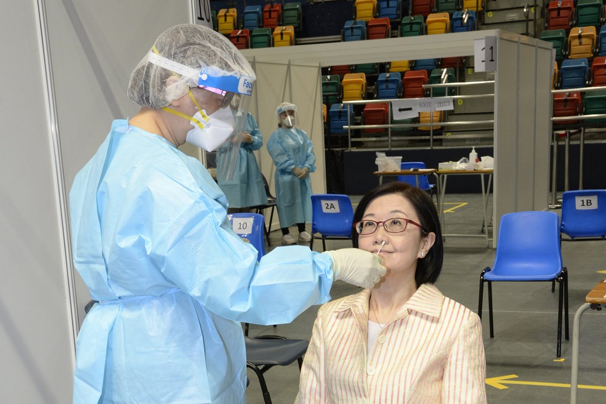 衞生署署長陳漢儀9月1日視察設於灣仔伊利沙伯體育館的社區檢測中心,了解中心在普及社區檢測計劃首天運作的情況,並即場接受採集鼻腔和咽喉合併拭子樣本以作檢測。