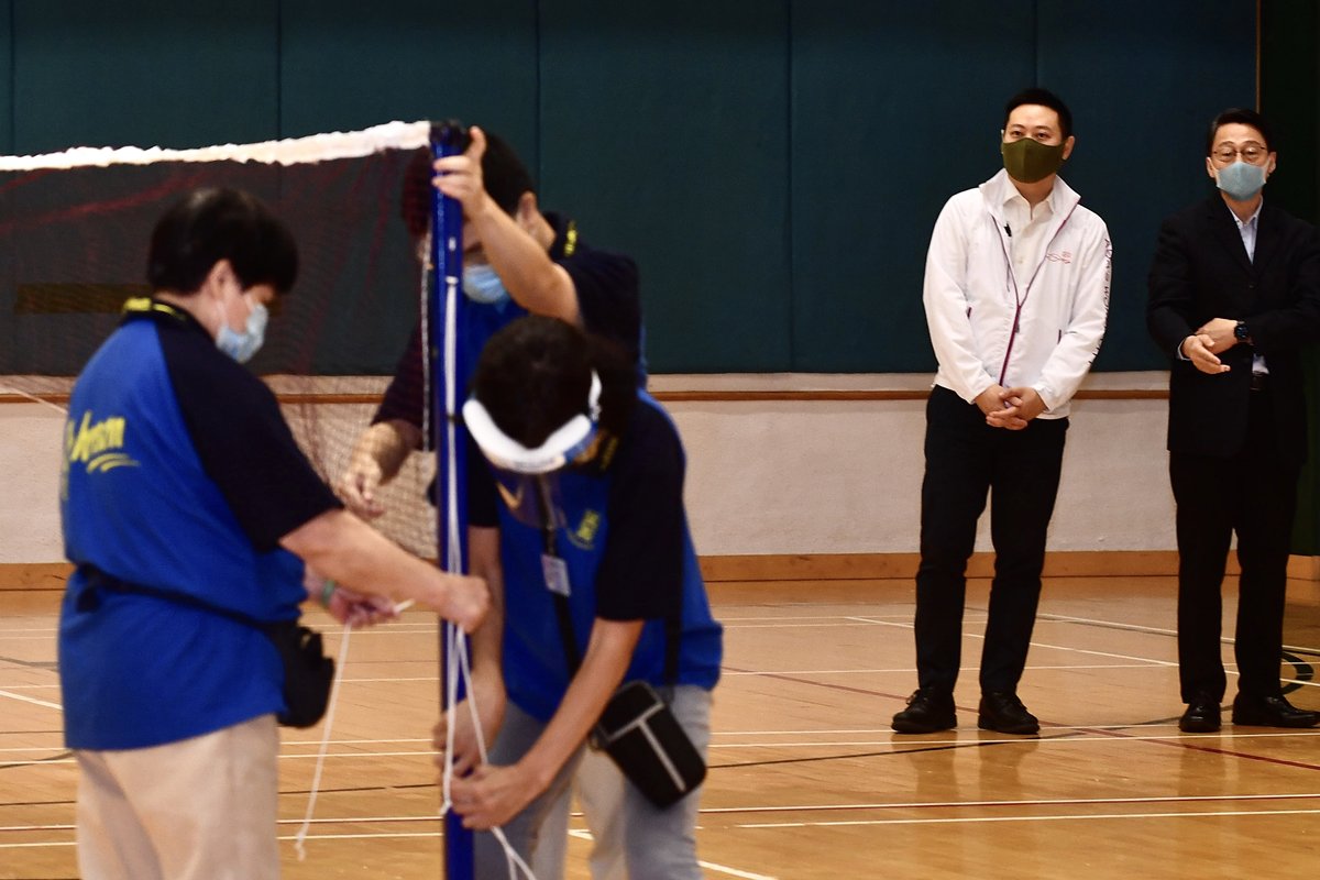 黃泥涌體育館曾用作社區檢測中心,康樂及文化事務署上周六開始還原場地,進行深層消毒清潔,並重新裝置運動設備,以供公眾訂場使用。民政事務局局長徐英偉9月16日到訪,視察場館準備重開的情況。