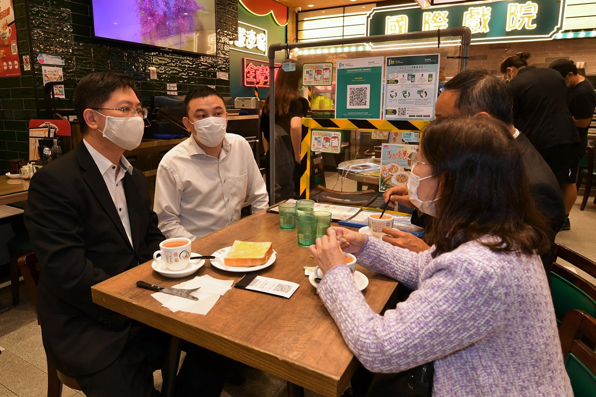 薛永恒隨後到附近一帶的卡拉OK、茶餐廳、足部按摩店、酒吧、麵店、酒樓等商鋪巡視,與商戶和市民交談,聽取他們對「安心出行」流動應用程式的意見。