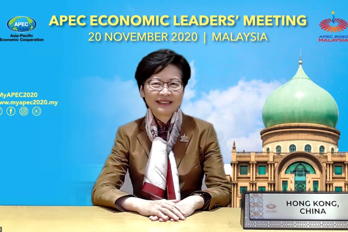 行政長官林鄭月娥出席以視像方式舉行的亞太區經濟合作組織2020領導人非正式會議,與其他經濟體領導人就應對新冠肺炎疫情、推動經濟復蘇,以及促進持續和共融發展等議題交換意見。