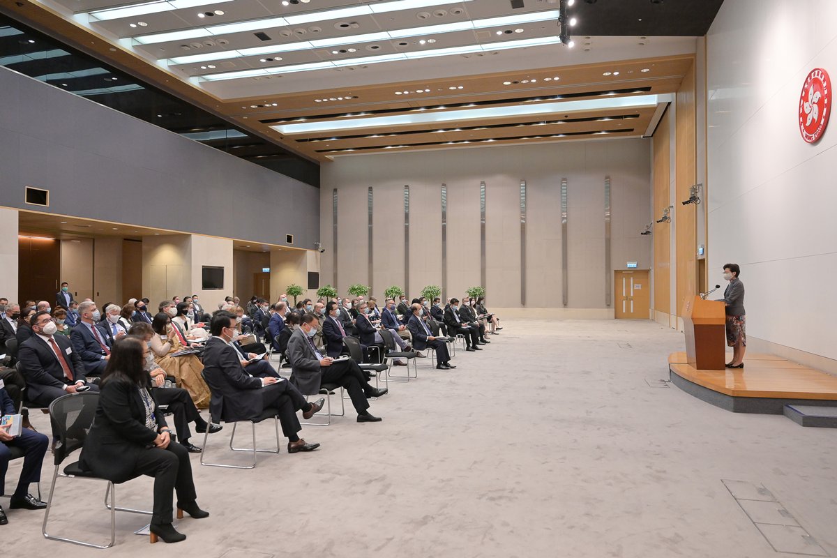 行政長官林鄭月娥11月26日與外國領事團和國際商務委員會成員會面,向他們簡介2020年施政報告,超過80人出席。