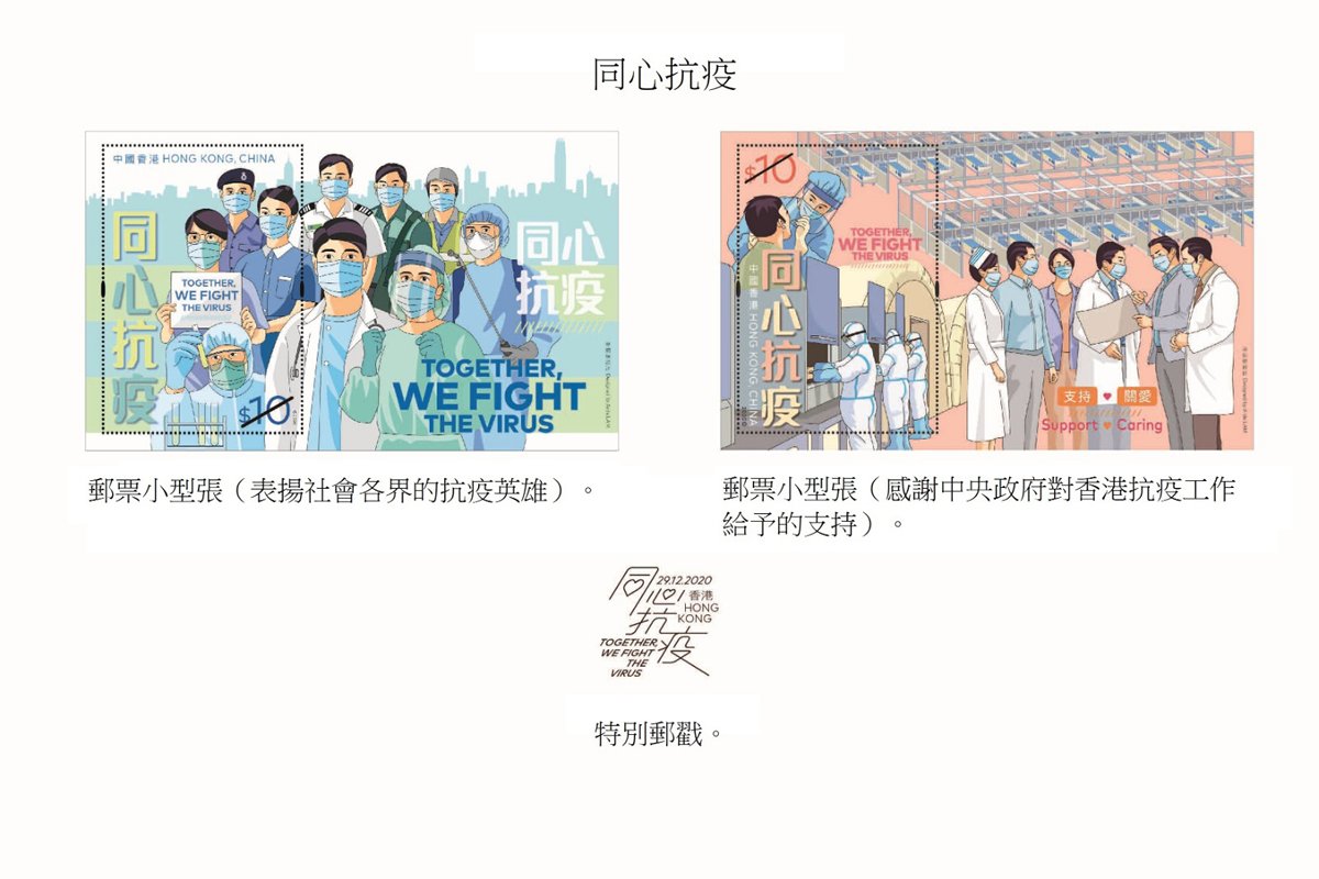 香港郵政12月29日發行以同心抗疫為題的郵票小型張和首日封,12月16日起接受預訂;其他相關郵品則於明年1月26日起發售。