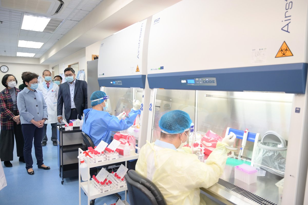 行政長官林鄭月娥12月25日到訪五間協助政府推行2019冠狀病毒檢測工作的私營化驗所,了解它們的後勤工作,並向當值員工送上節日祝福。