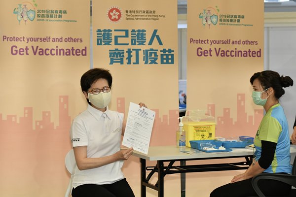 林鄭月娥早前曾說,作為行政長官,只要第一款獲認可使用的疫苗抵港,她便會接種該款疫苗,2月22日她與其他官員率先接種由內地研發和生產的克爾來褔疫苗(CoronaVac),希望在社會上起示範作用。