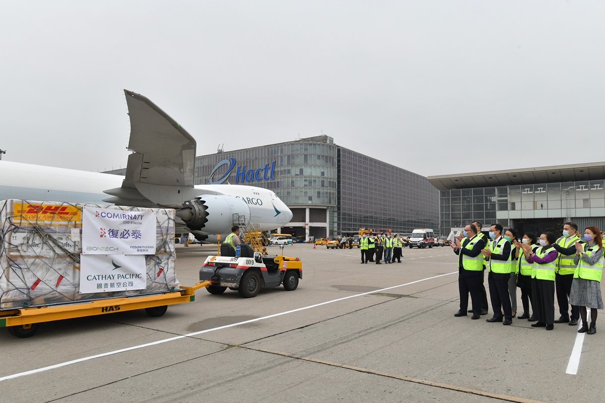 首批100萬劑復必泰疫苗會分兩班航班運送到港,餘下劑量將於3月初到港。