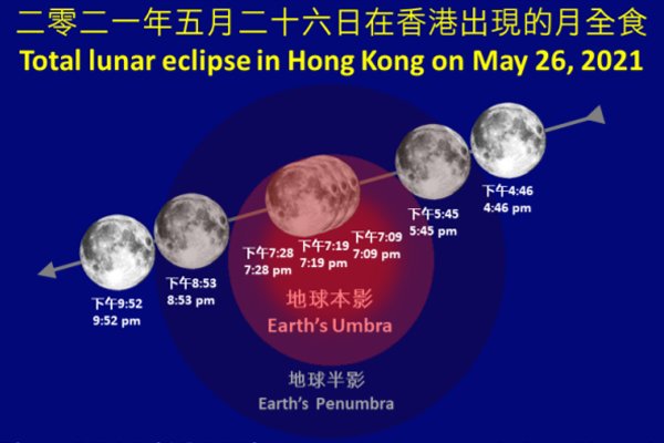 2021年05月11日 06:00 新聞類別 港聞 詳情# 天文台表示,5月26日將出現月全食,同日也會出現超級滿月,即全年最大滿月,屆時月亮直徑會較平日的滿月大約7%。如天氣情況許可,面向東南方而沒有障礙物的地點為觀賞月食最佳位置。 月全食下午7時9分開始,7時28分結束,食甚時間為7時19分。 由於今次月全食在月出前開始,月亮會帶食而出。 天文台指,太陽光中的藍色波段在地球大氣層散射,剩餘的紅光再折射到月球上,所以月全食期間月亮不會完全消失,而會呈現暗紅色。 市民屆時可透過聯合網上直播觀賞月食過程,另可到天文台網頁參閱有關天氣情況及觀測條件。 下次在香港可以看到的月食會是11月19日出現的月偏食。 資料來源 政府新聞網 0 0 0 書籤 留言 (0) 登入即可留言