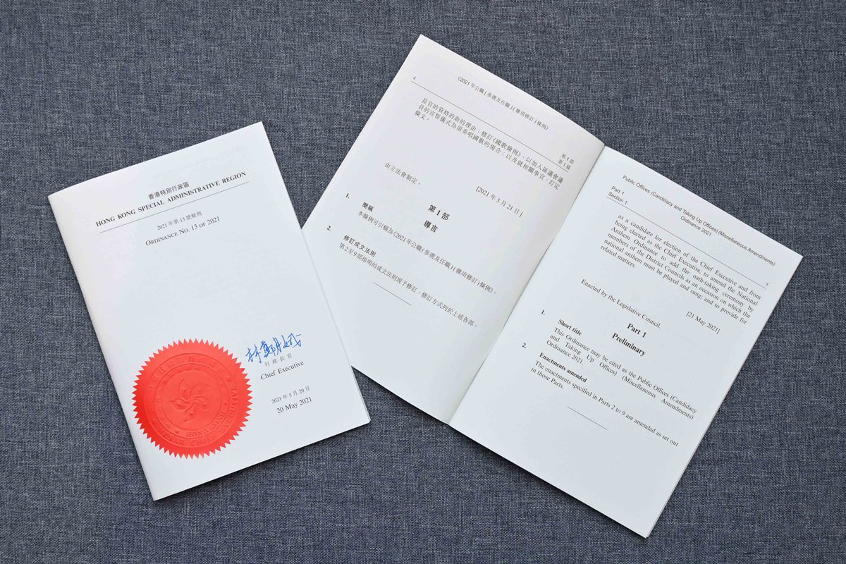 行政長官林鄭月娥5月20日根據《基本法》第48條第三款簽署經立法會通過的《2021年公職(參選及任職)(雜項修訂)條例》。條例5月21日刊憲公布後正式生效。