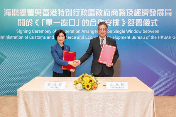 商務及經濟發展局與國家海關總署5月19日簽署關於《「單一窗口」的合作安排》,進一步加強香港與內地在單一窗口的合作和交流,推進兩地系統對接。合作安排由商經局局長丘應樺和海關總署署長孫梅君簽署。