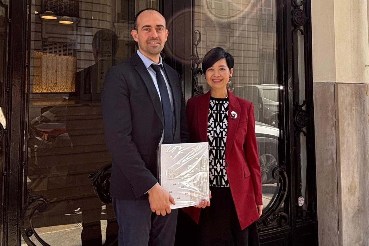 何永賢下午拜會中國駐法國大使鄧勵,向他介紹香港最新的房屋政策和措施,包括善用大灣區的力量,推進建屋科技發展,也從與大使的交談中了解香港作為超級聯繫人和高度國際化城市的優勢。