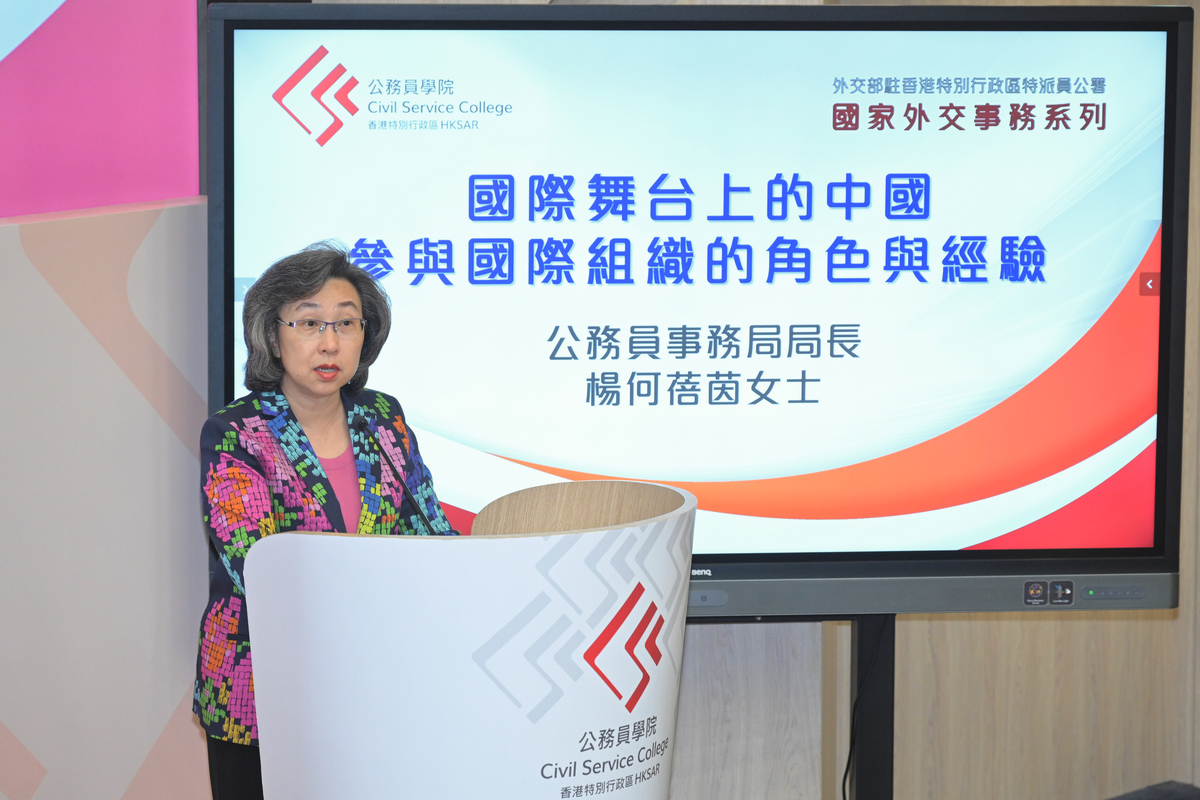 公務員事務局局長楊何蓓茵在講座致辭時表示,特區公務員肩負聯通國家與世界的使命。在中央政府的支持下,特區政府派出獲外交部推薦的青年公務人員參與聯合國初級專業人員方案,讓他們為國家和國際組織貢獻所長。
