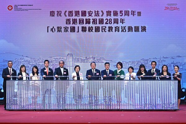 教育局7月4日舉行慶祝《香港國安法》實施五周年暨香港回歸祖國28周年心繫家國聯校國民教育活動匯演,展示本學年心繫家國活動的豐碩成果。政務司副司長卓永興、教育局局長蔡若蓮為活動主禮。