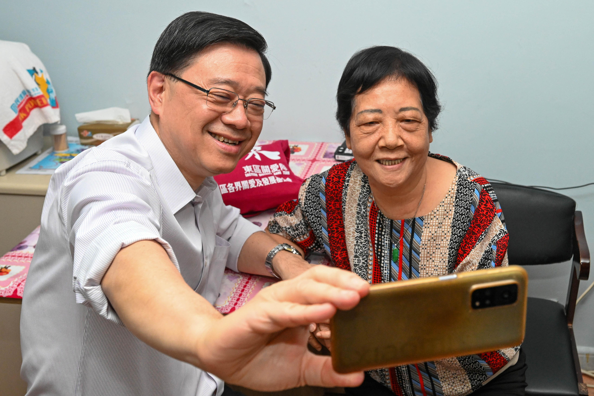 李家超先到訪愛東邨,探訪邨內獨居長者,了解他們的日常生活和地區服務及關愛隊伍提供的支援,又與邨內不同居民交流,聽取意見。