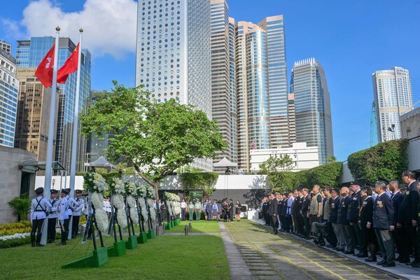 署理行政長官陳國基和特區政府高層官員9月3日早上在香港大會堂紀念花園出席特區政府舉行的官方儀式,紀念中國人民抗日戰爭暨世界反法西斯戰爭勝利80周年,銘記中國人民抵抗日本侵略,緬懷先烈和死難同胞。