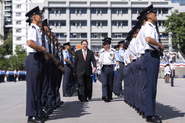政務司司長陳國基9月6日出席警察學院結業會操,檢閱30名見習督察和182名學警,見證他們正式成為警隊的一分子,並勉勵結業學員以同理心理解市民的需要,以高效率行動回應社會的關注。