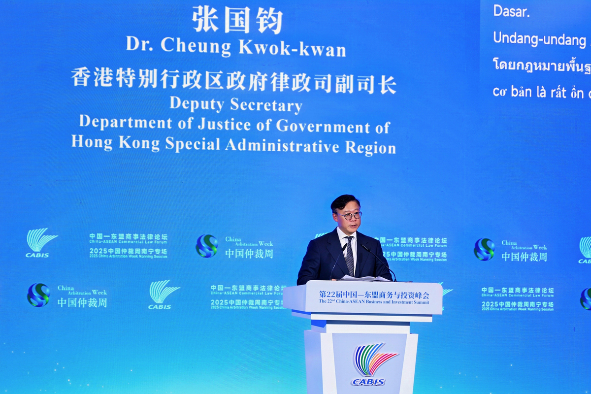 律政司副司長張國鈞9月18日在廣西南寧出席中國---東盟商事法律論壇,推廣香港法律服務在支持企業「引進來」及內企「走出去」的優勢,促進桂港攜手支持內企開拓海外市場。