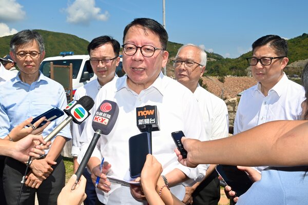 保安局局長鄧炳強、環境及生態局局長謝展寰,以及運輸署、警方和漁農自然護理署的代表陪同到東壩視察。