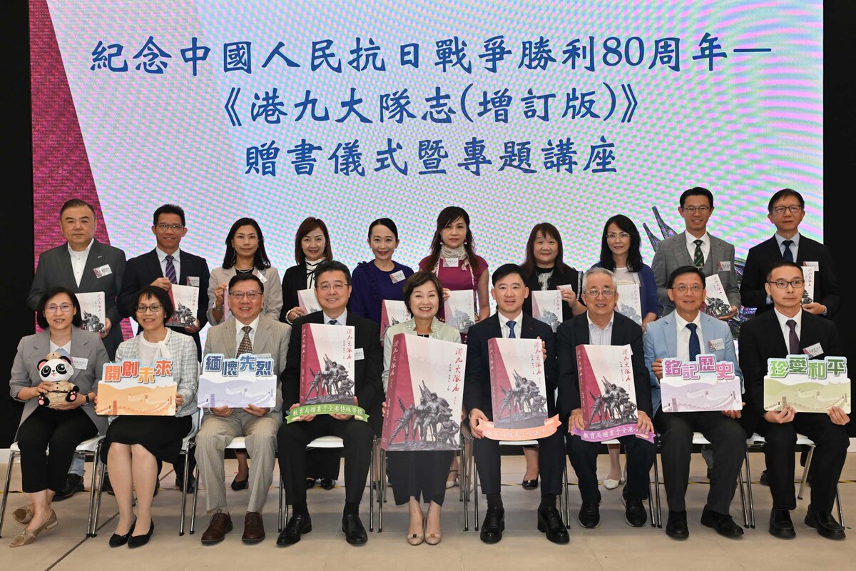 教育局10月21日舉行紀念中國人民抗日戰爭勝利80周年---《港九大隊志(增訂版)》贈書儀式暨專題講座,局長蔡若蓮將《港九大隊志(增訂版)》贈予學校議會及校長會代表,以豐富教授抗日戰爭的相關內容,提升學與教成效。