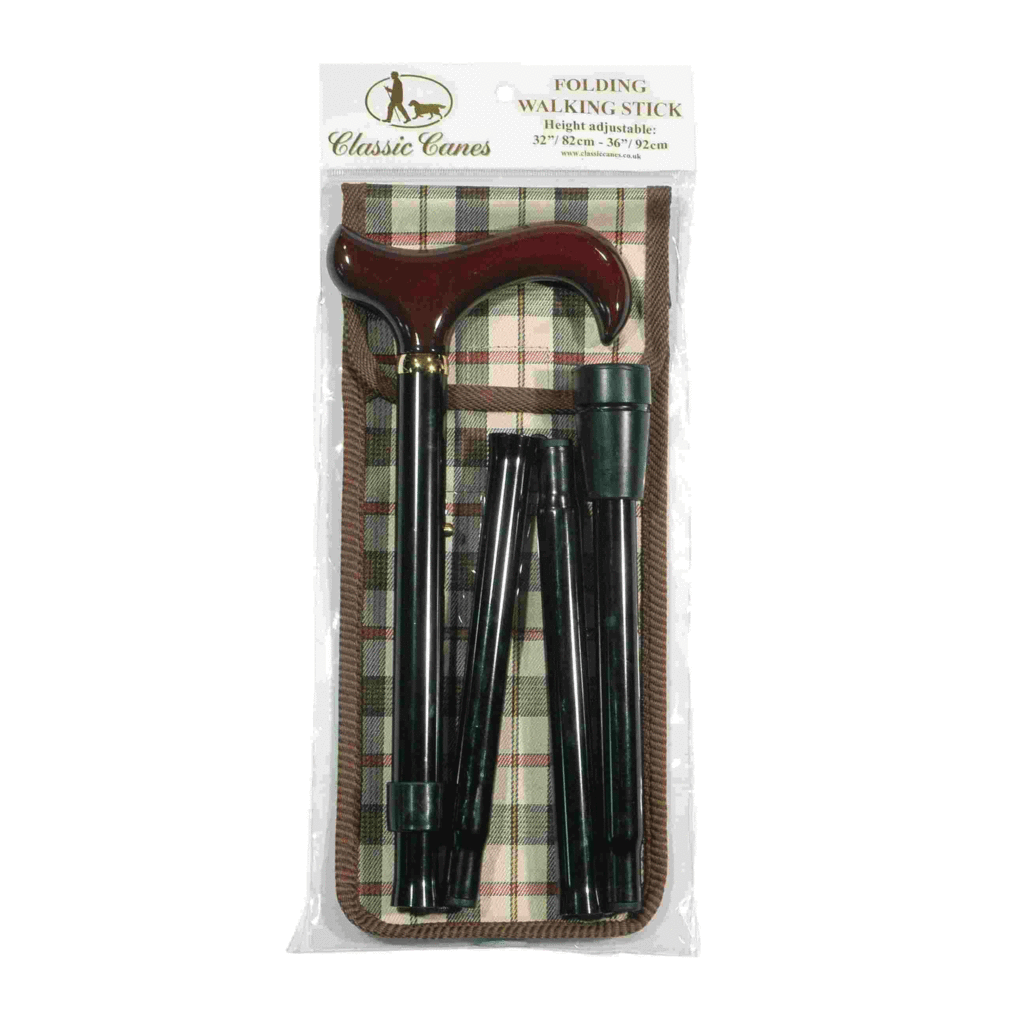 一款經典的可摺式手杖。酒紅色的木柄配上黑色鋁質杖身。手柄的形狀提供了舒適的支撐,不使用時可以鉤在手臂。長度由82至92厘米。配有米色格仔袋。