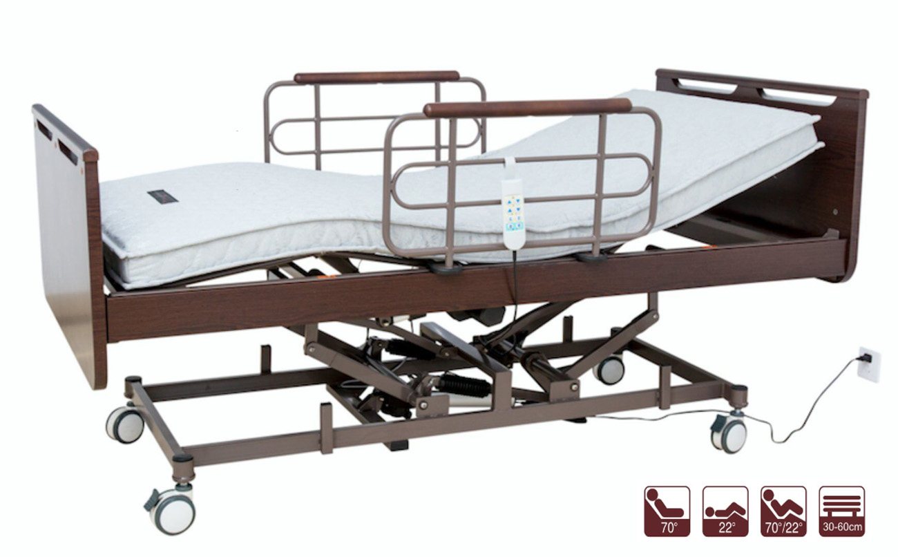 - 床面高度可在距離地面30cm-60cm之間調節,升高方便照顧者的日常護理工作,降低讓使用者容易下床。
