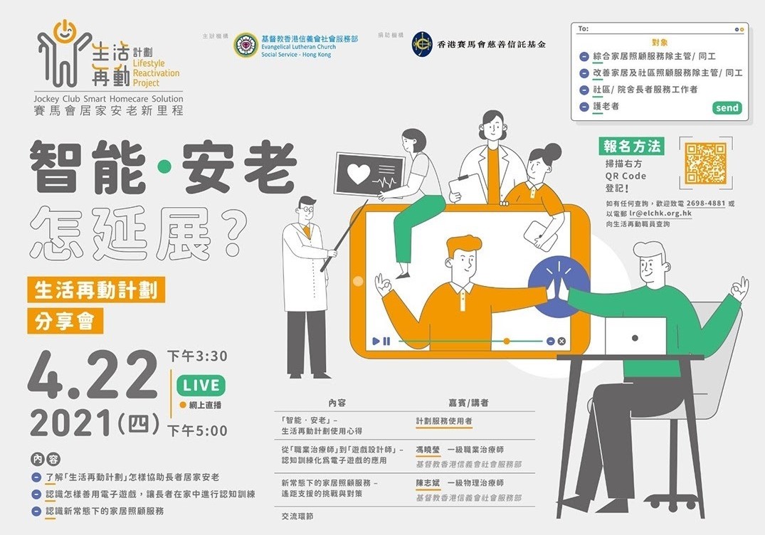 是次分享會將介紹「生活再動計劃」怎樣在家居照顧服務中協助長者居家安老,並在疫情中面對新常態的挑戰下仍能協助長者進行照護服務,詳情如下:
